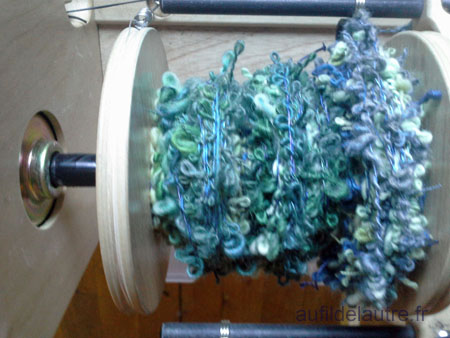 - en chaîne: j'ai filé en bouclé (selon le livre de Sarah Anderson et sa vidéo sur craftdaily) du polwarth et de l'alpaga en séquences multicouleur, au pif -> dans des peignes de 5dpi - retordu sur soie de la brocante sociale de Nivelles (récup' - le Bric, faisons leur une pub)