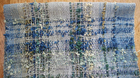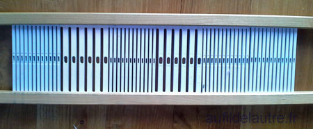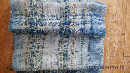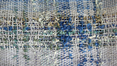 Le fil de trame doublé est le même que le projet précédent (à bandes bleues/noires), le même tassage - ce qui me permet de comprendre le comportement des matières.