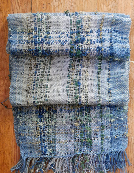 Une étole? écharpe? de 35cm de large et de 2.10m de long, pour tester comment mettre en valeur un bouclé filé main en chaîne. En trame, les fils fantaisie alourdissent le drapé, je trouve. Ici, écharpe méga douce, tombe bien. Malgré les photos traîtres, le "tissu" a plus de tenue que mes autres essais. A voir comment tiendront la distance les formes de jours autour du bouclé.