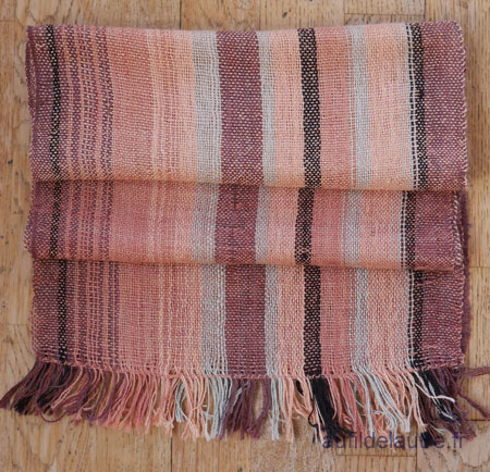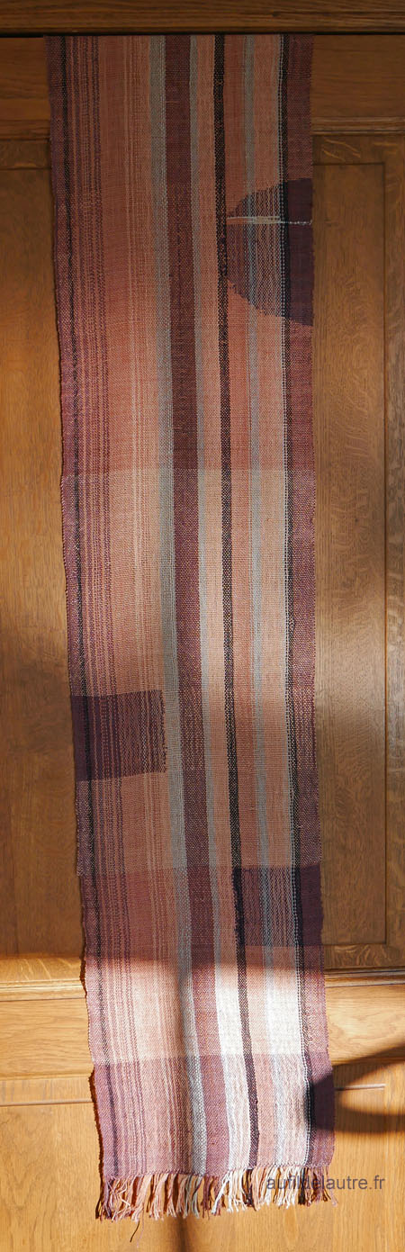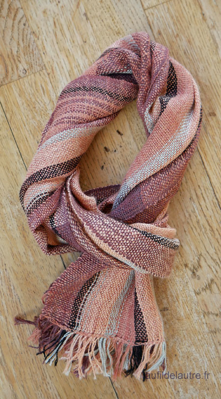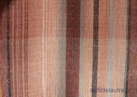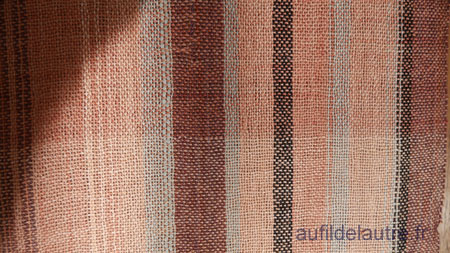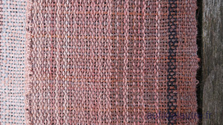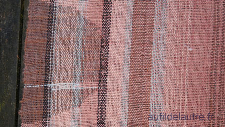 Plein de petits défauts, mais bon on n'est pas le tissu commercial. Petits sautés que les tisserands verront tout de suite. Le fil ondulant: ça partira avec le lavage.