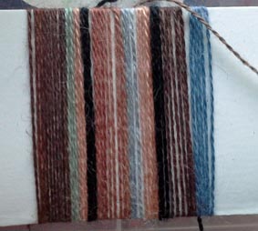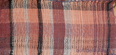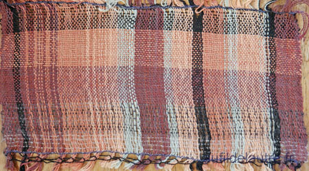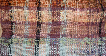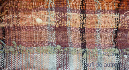 2/ A la fin du tissage, j'ai gardé une vingtaine de centimètres pour voir ce que donneraient dans une chaîne si fine des fils fantaisie que j'ai filés main pour partie