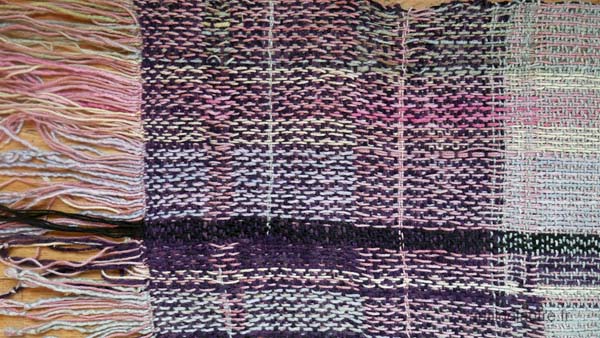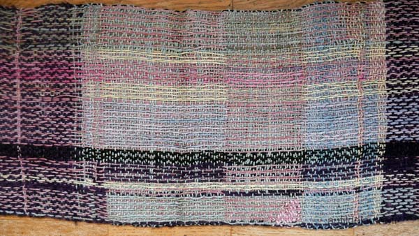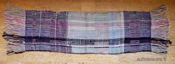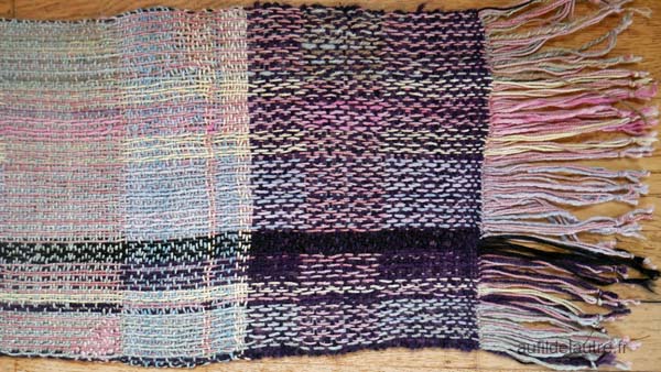 Le fil prune foncé, presque cardinalice, est un accident de teinture: cochenille et fer, aluné deux fois. Bonne surprise...