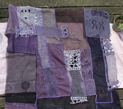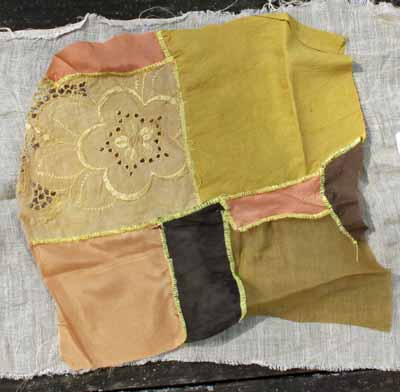 La jointure est cousue machine au point de bourdon très serré (ici: au fil polyesther, à la machine). Tous mes bouts de tissus lin/soie/coton, teints en végétal (campêche) l'année passée. C'est plus joli que des chiffons dans une chemise plastique, n'est-ce pas? Il reste à les mettre en scène...