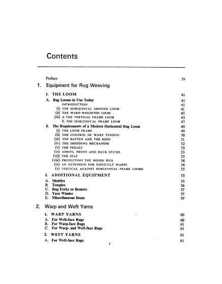 Le livre Techniques of Rug Weaving est en plusieurs parties, gracieusement scanné et partagé par Ralph E. Griswold sur cs.arizona.edu. Vu qu'il est scanné image, on ne peut y pratiquer de recherche. La table des matières est assez détaillée pour qu'on s'y retrouve. Je la partage ci-dessous. Si jamais je finis sur une île déserte, ce livre me servira pour occuper mes journées jusqu'à la fin des temps!