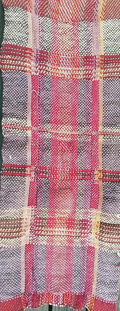 fils de trame = rouille, brun tête de nègre, prune foncée et beige