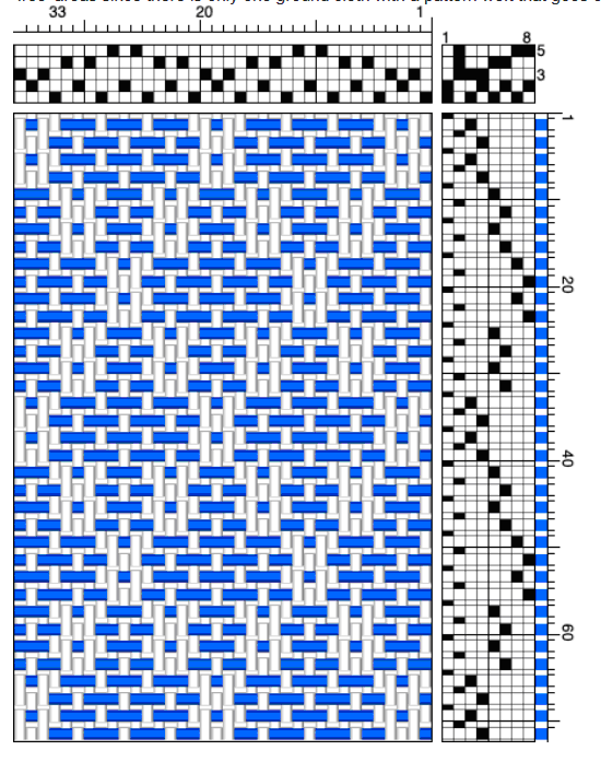 En été et hiver, pour chaque bloc, il y a un seul cadre de motif et deux cadres pour les liaisons ... les cadres 1 et 2. D'où l'expression " 'single two tie” . . . un seul cadre de motif et deux cadres pour les fils de liaison, à chaque blocLes flottés de la trame , pour le motif, sont limités à une longueur de flotté de trois fils.