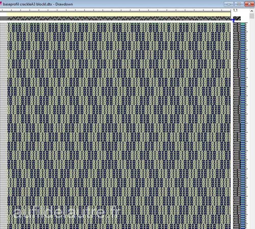 J'ai utilisé un profil de base, et utilisé la fonction "block substitution" de Fiberworks. En demandant un crackle marché en été/hiver. Ce sera une base de travail: sergé suivi 3* en ascendant + microchevron + sergé suivi 3* en descendant puis sergé suivi 2* + chevron complet + sergé suivi 2*. Pour comparer l'effet final d'un chevron complet et un microchevron.