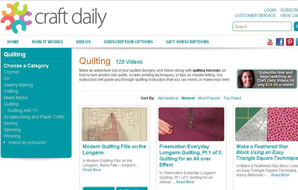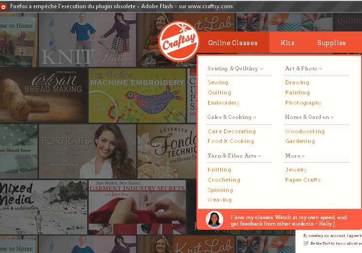 Mon autre portail de vidéos est craftsy.com, qui pratique un autre système: on achète une vidéo à vie (+-15€, car promos permanentes), qu'on ne télécharge pas mais qu'on peut regarder aussi souvent qu'on veut. Le prof répond aux questions, les élèves partagent leurs projets et leurs questions/réponses. Très convivial.