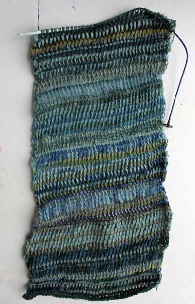 J'en ai fait une écharpe en "drop stitch" tunisien, en incluant un peu de triche: de la laine bleu foncé très vaporeuse dont à propos de laquelle je ne sais même plus d'où elle vient.