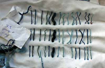Ma nouvelle proposition (non finie sur la photo): je couds les bouts de laine (de 20 à 50 cm selon les tests), avec leur étiquette de teinture (en tyvek) encore accrochée, dans des carrés de tissu de récup'. Celles qui dépassent de 30cm vers le bas: je les laisse.