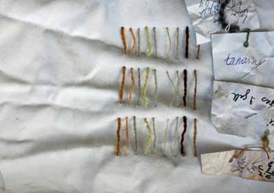 Les étiquettes sont cachées au dos pour l'instant, mais forment un volume désagréable. Je vais écrire à l'encre végétale faite maison, à la plume, les commentaires de production: type de laine, t ype de bain de teinture. Ce seront des numéros au-dessus des brins de laine. Les commentaires complets seront sur une feuille de papier japonais, roulée, accrochée au bord de chaque page.