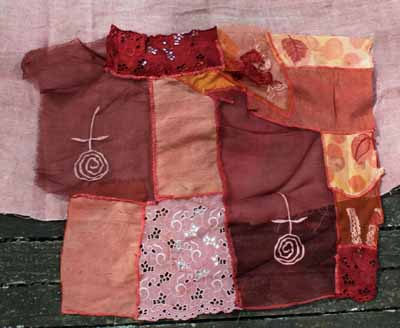 La jointure est cousue machine au point de bourdon très serré (ici: au fil polyesther, à la machine). Tous mes bouts de tissus lin/soie/coton, teints en végétal (campêche) l'année passée. C'est plus joli que des chiffons dans une chemise plastique, n'est-ce pas? Il reste à les mettre en scène...