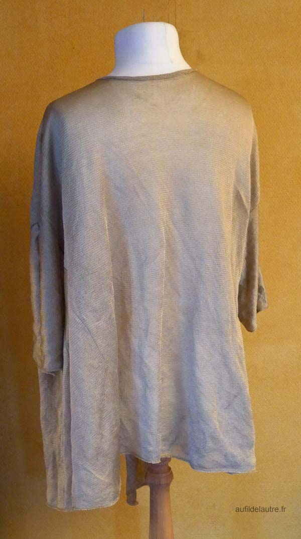 A ce stade-ci uniquement assemblée par surjet intérieur. Manque encore les coutures finales et les ourlets (peut-être?). Car je ne sais encore comment je vais la transformer: avec des parties de tissage? de tricots récupérés sur de vieux pulls? d'autres tissus un peu flous? Ou rien...