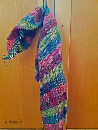 En fil fin: coton 16/2, alternant les couleurs dans un camaieu "automne", brun et jaune. La bobine jaune en chenille est assez flash en soi, mais son ton est tempéré par la chaine.