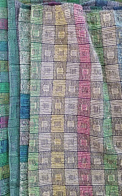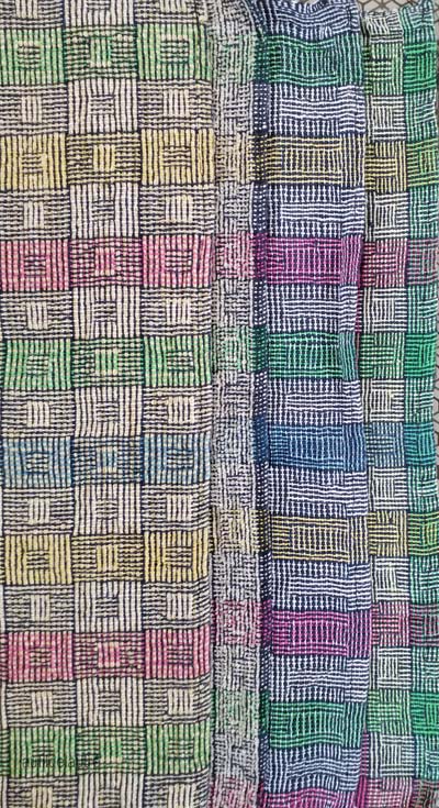 30.8.2020 Shadow weave, une très longue chaîne en coton 16/2, selon le modèle 4.47 (?) de Powell, vu sur Ravelry - Cinquième tissu, en déclinaison trame chenille du commerce, acheté chez Mercerie Duquesnoy à Roubaix (récupération de fonds d'usines).