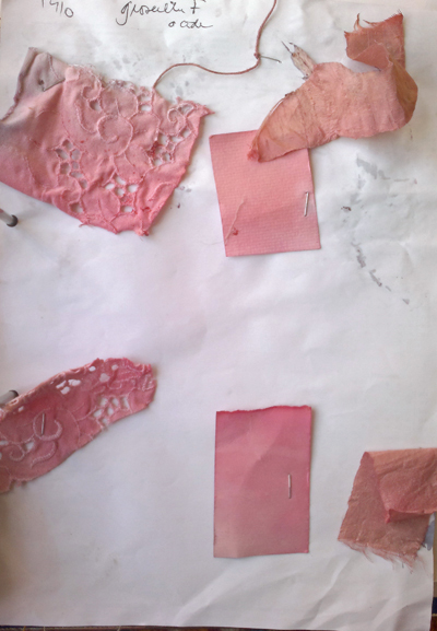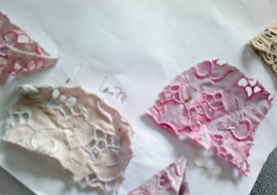 novembre 2012: broyat de groseilles en fermentation, après 3 bains acides et alcalins sur 3 jours - sur coton, papier, soie