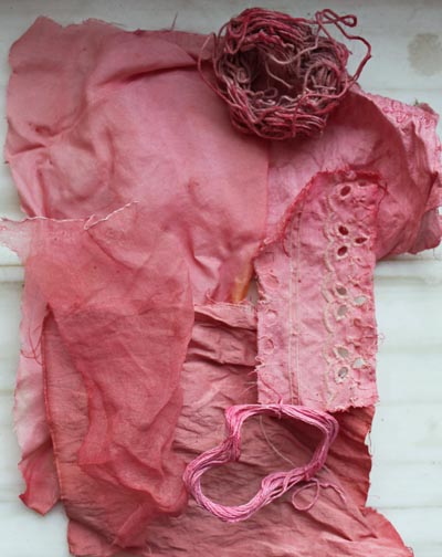 Peut être mon traitement de nettoyage radical (savon de marseille et cristaux de soude, très alcalin) a fait mordançage. Ben non, car j'ai testé une autre sorte de coton: des chutes d'une doublure des nouveaux rideaux du salon; écru; pur coton; non bio (Chien Vert); lavés machine une seule fois. Non mordancé non plus et non nettoyé aux cristaux de soude. Ce nouveau test me donne les mêmes résultats que le coton dentellé/mercerisé des tests précédents ou que le coton solidement décati: belle prise de couleur. Le lin de l'arrière grand père d'Alex, décati récemment, préparé par bain de lait ou de blanc d'oeuf, a bien pris les couleurs dans les cuves de macérations, mais pas plus que la version alunée.