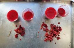 broyat résiduel après extraction du jus dont je fais des gelées: au lieu de le jeter au compost, je le mets en fermentation à la Rieger pour évaluer la couleur. La photo avait été utilisée lors de mes tests comparatifs de deux machines (nous sommes importateurs). J'ai utilisé bien plus de broyat que ce que l'on ne voit sur la photo.