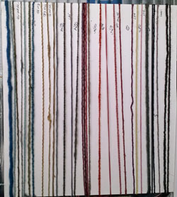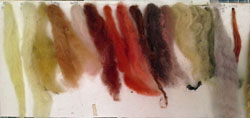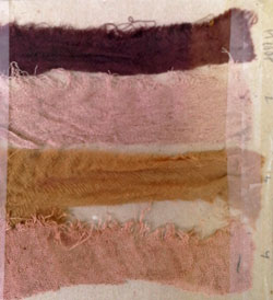 Seule l'orcanette sur laine (en monobain acide, à semibouillon - échantillon tout au dessus de la photo) a beaucoup perdu de vivacité. le ton est resté stable, mais très atténué.