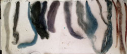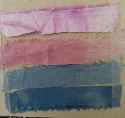 Echantillons du bas: étamine de laine en indigo à froid, pH 10 MAIS à l'hydrosulfite alors que mes autres tests, pH 10 à froid en cuve organique n'ont pas bougé, après 3 semaines dehors. Ne pas hydrosulfiter à froid. Retester.