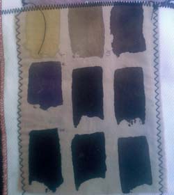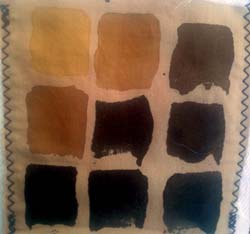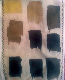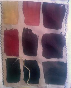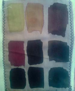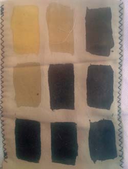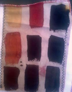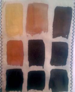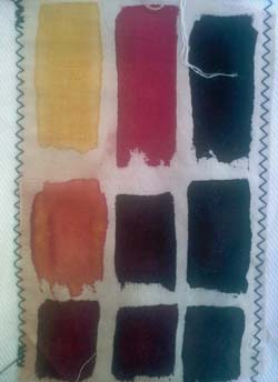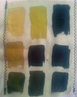 En cumulant les essais ci-dessous avec la cuve indigo, j'aurai quasi toutes les couleurs. Sous les photos, j'ai souligné en gras les tons que je garderai. On pourrait les découper et s'en faire une roue chromatique. Les photos ne sont pas fiables, j'ai noté les couleurs réelles. Les fonds ont été nettoyés au savon de Marseille. Depuis lors, j'ai réuni les tests en une forme de livre relié.