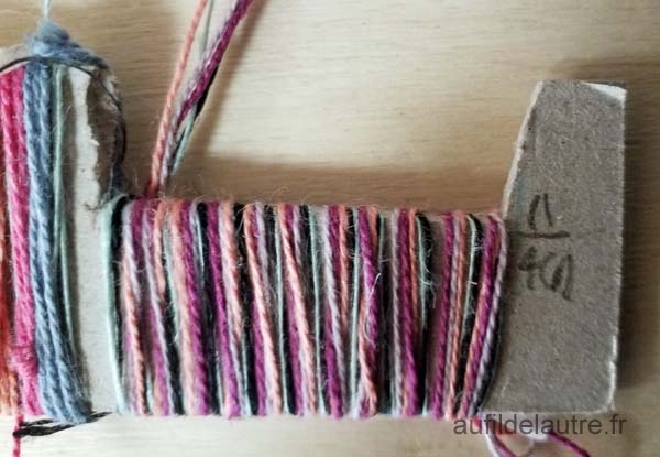 J'en profite pour tester des cotonlins de chez Venne "bio" ou approchant. Ce sont des fils provenant de mon calcul de densité d'un torchon de vaisselle, encore enroulés bien commodément sur leur carton. La réputation d'instabilité lumière des teintures végétales est une rumeur, car toutes les teintures passent. Je gage que celles-ci vont aussi soufrir de cette exposition excessive à la lumière. Il suffit de comparer les rideaux d'une fenêtre plein sud, en tissu classique: endroit et envers n'ont pas la même figure.