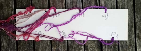 Quand les journées auront 26 heures, je testerai aussi la résistance au lavage avec le test assez simple mais fastidieux qu'on apprend chez Jenny Dean : coudre les fils teints entre deux épaisseurs de coton très blanc, les passer en machine et évaluer les possibles traînées. Pour le test lavage classique, c'est on ne peut plus simple: laver la moitié du fil et pas l'autre. Plus simple, y a pas.