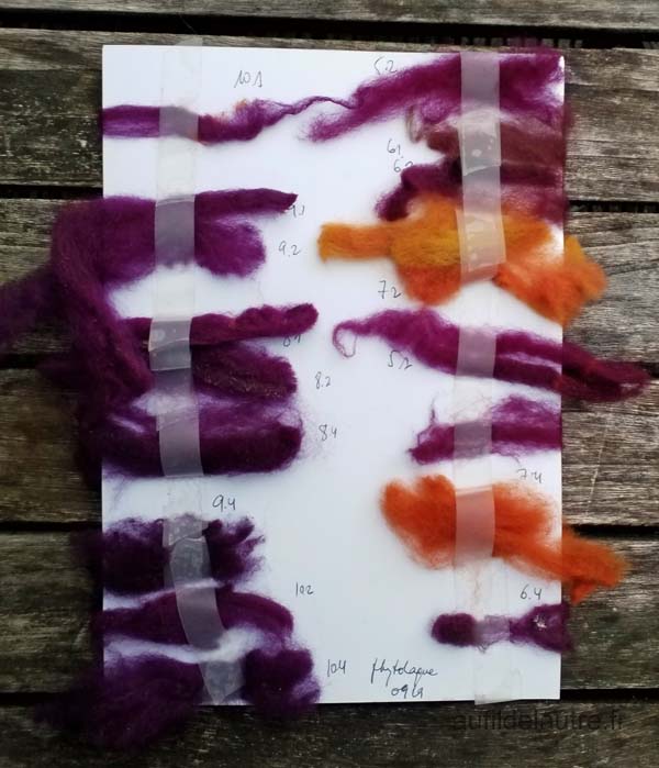 10.10.19 Quand j'ai amorcé les teintures à basse température, j'ai fait des tests domestiques de résistance à la lumière qui m'ont semblé concluants - voir le billet de juillet 2015. Je recommence ce mois d'octobre, profitant d'un séjour près de Montauban, où j'aurai plus d'UVs qu'en Belgique. Sur deux teintures réputées peu stables, que j'ai menées d'une façon peu orthodoxe.