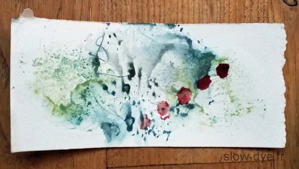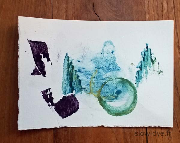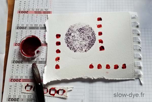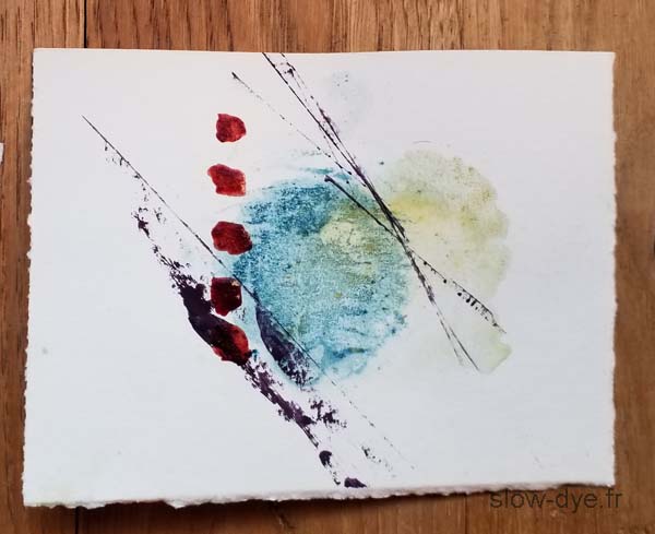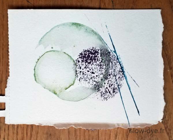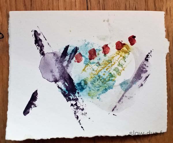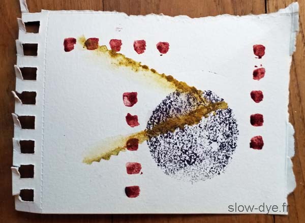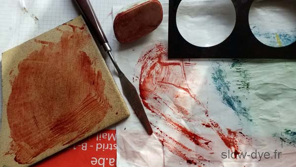 rouge de garance à la tranche du couteau, cercles avec les couvercles de boite de Pétri du c offret. Mauve de campêche au couteau glissé, récup' du broyage