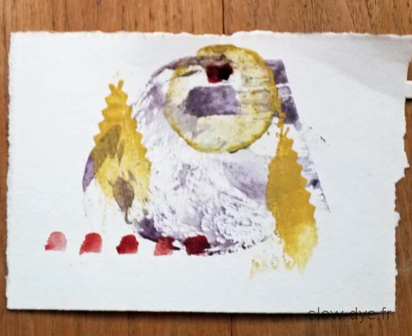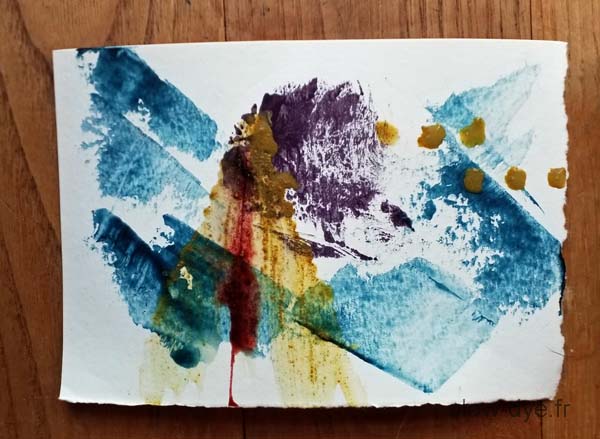 rien perdre de ces précieux pigments. Je racle la pierre à broyer et le couteau sur une récup' de bureau (du fond de papier à étiquettes, glacé). Cela me fait un monotype du pauvre, que dis-je? arte povera de récup' bureautique.