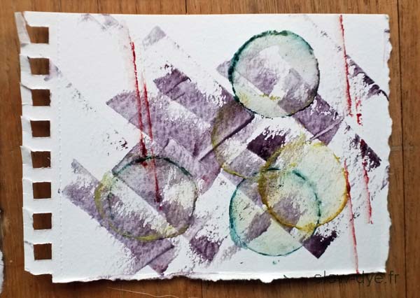 Tant que c'est humide, je retourne une de mes cartes au travers d'un cercle. Je frottouille du doigt et je récupère. Le reste sur le carreau: j'humidifie et je peins un fond. Rien ne se perd!