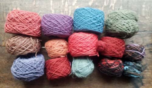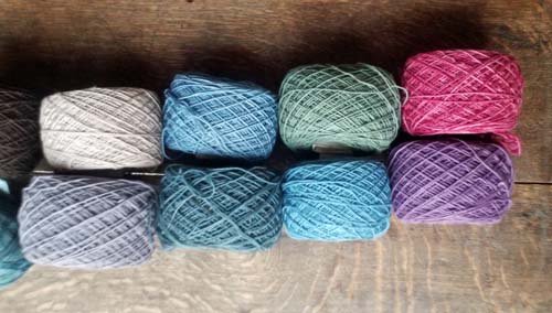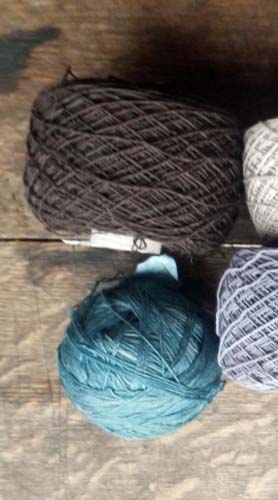 Puis les cotons : 8/2 de chez Venne, sauf le gris perlé en haut à gauche est du mercerisé sans marque (achat brocante sociale). Cet écheveau n'était pas mordancé, je l'ai teint dans une fin de bain de bogues de noix d'Amérique et de fer. J'achète le 8/2 en bobines d'un kilo, chez Venne même.