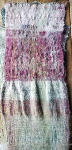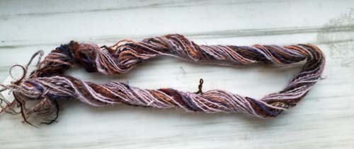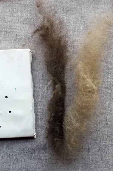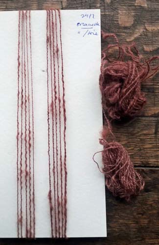 Les locks au sortir du bain (voir état à gauche). Je les ai cardés (milieu) puis filés soit retordus sur lui-même, soit retordu avec un fil de soie très fin. Avant d'aller plus loin, je vérifie si le ton généré me convient (voir droite). En effet, retrodre avec un fil de soie (du commerce) me donnera un bon fil de chaîne, j'en tirerai le double, en forme plus fine, de la variante retordue sur lui-même. Il n'y a pas de petit profit... du moment que le rose grisé cuivré de l'orcanette que j'aime tant passe encore.