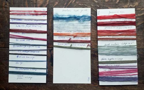 Mon inventaire sur cartonnette, par type de fil. Je les ai sous les yeux quand je choisis quels fils tisser dans quel modèle.