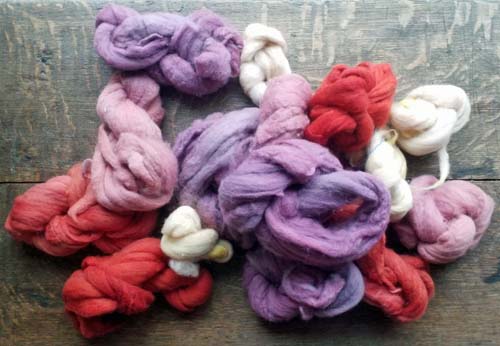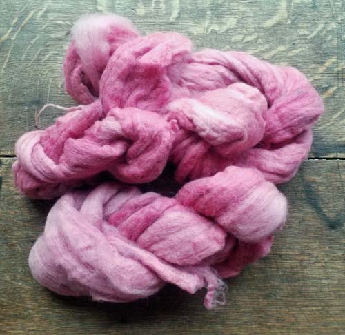 Viennent ensuite les rubans de merinos d'Arles, la source la plus proche que j'ai trouvée pour cette laine si fine, si douce. Rubans qui seront filés en séquentiel - ici premier bain en cochenille