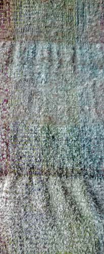 J'ai surteint des pans de tissages en laine dont les tons ne me convenaient pas (jaune et rouge, des fins de stock: beurks). Passés en indigo pour unifier les tons. Le résultat coloré est très beau. Comme j'ai besoin de parties feutrées pour des sacs, je profiterai de ce que j'ai été distraite et que j'ai passé ces pans en séchage "délicat" alors qu'ils contiennent soit du mérinos soit du chamelon. Les autres fibres supportent très bien ce traitement: le gotland, le blue face leicester, le mohair même. Je couperai des morceaux dans le tas.