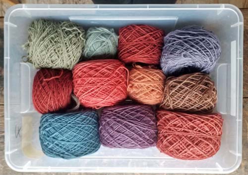 Je garde les laines dans des bacs en plastique. Oh! l'excursion hors du plan écolo? Ben oui, après tant d'essais pour ne pas partager mes stocks avec les mites textiles, je n'ai trouvé que cela comme solution.