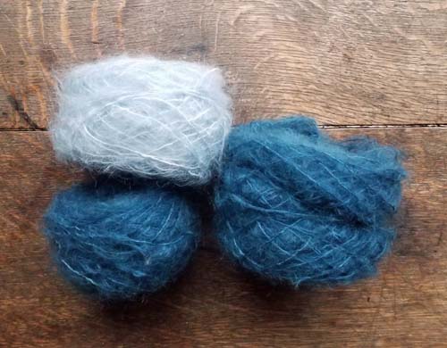 Il me restait du mohair/soie de France blanc. Deux pelotes oubliées 8 heures dans la cuve d'indigo. La première: un trempage, ce qui une erreur technique mais on verra bien à l'usage. Les tissages en mohair sont rarement des mélanges fantaisistes, je pourrai toujours reteindre après.