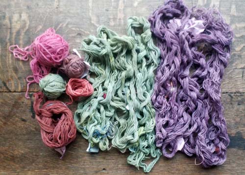 En divers tons (fin de bain jaune, cochenille/campêche/ garance C, fin de cochenille):
