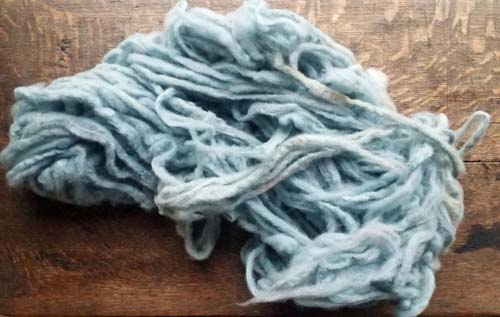 J'ai besoin de gros fils pour des effets de texture en tissage. J'ai feutré légèrement le ruban de mérinos teint en indigo, au séchoir ménager (programme délicat, sur finition laine cela ne feutre rien, sur programme habituel, ça feutre bien trop). Puis j'ai déchiré à la main de longues languettes.