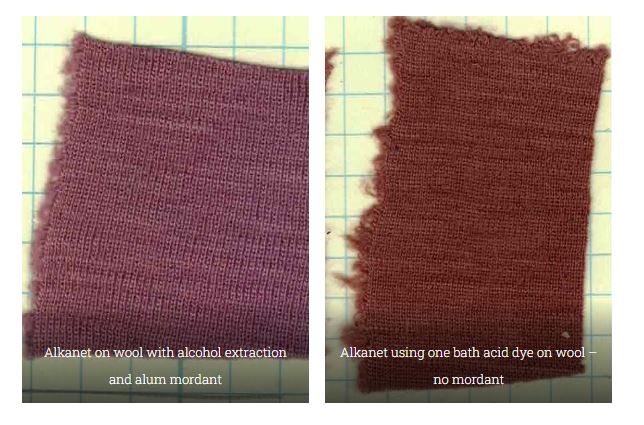 J'ai fait un tour chez Catharine Ellis, qui a fait deux teintures comparatives en orcanette, en janvier 2021. Le mordant n'y fait rien, je crois que c'est le procédé alcool versus monobain qui fait la différence: