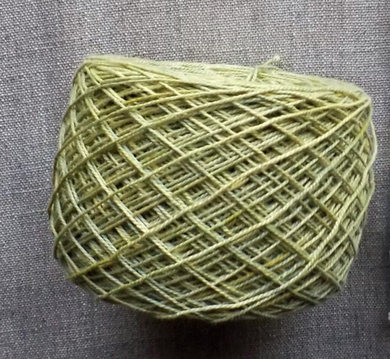 Cas à part, que j'ai teint le lendemain. J'ai cuit des roseaux de marais cueillis en juillet à la côte belge, sachant que, secs ou cueillis en septembre, ils ne donnent que du jaune. Comme j'ai besoin de vert clair, j'ai teint du coton 8/2 aluné en AA puis deux courts trempages dans la cuve d'indigo.