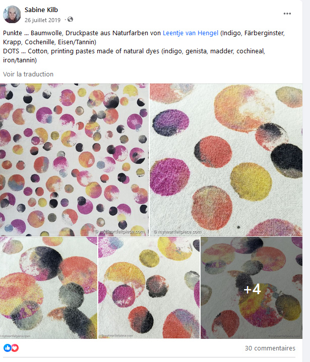 Je parsèmerai le tissu aléatoirement de cercles en gel de cochenille, de carmin, de sophora, de tanins au fer (acétate, gallique), de campêche et de garance, sur une longue bande (et pas partout, comme sur mon inspiration ci-dessous). Ce dernier sera préparé à base de laque plutôt que d'un extrait dense, ce que seront les autres. Inspirations d'une Sabine Kilb sur fb