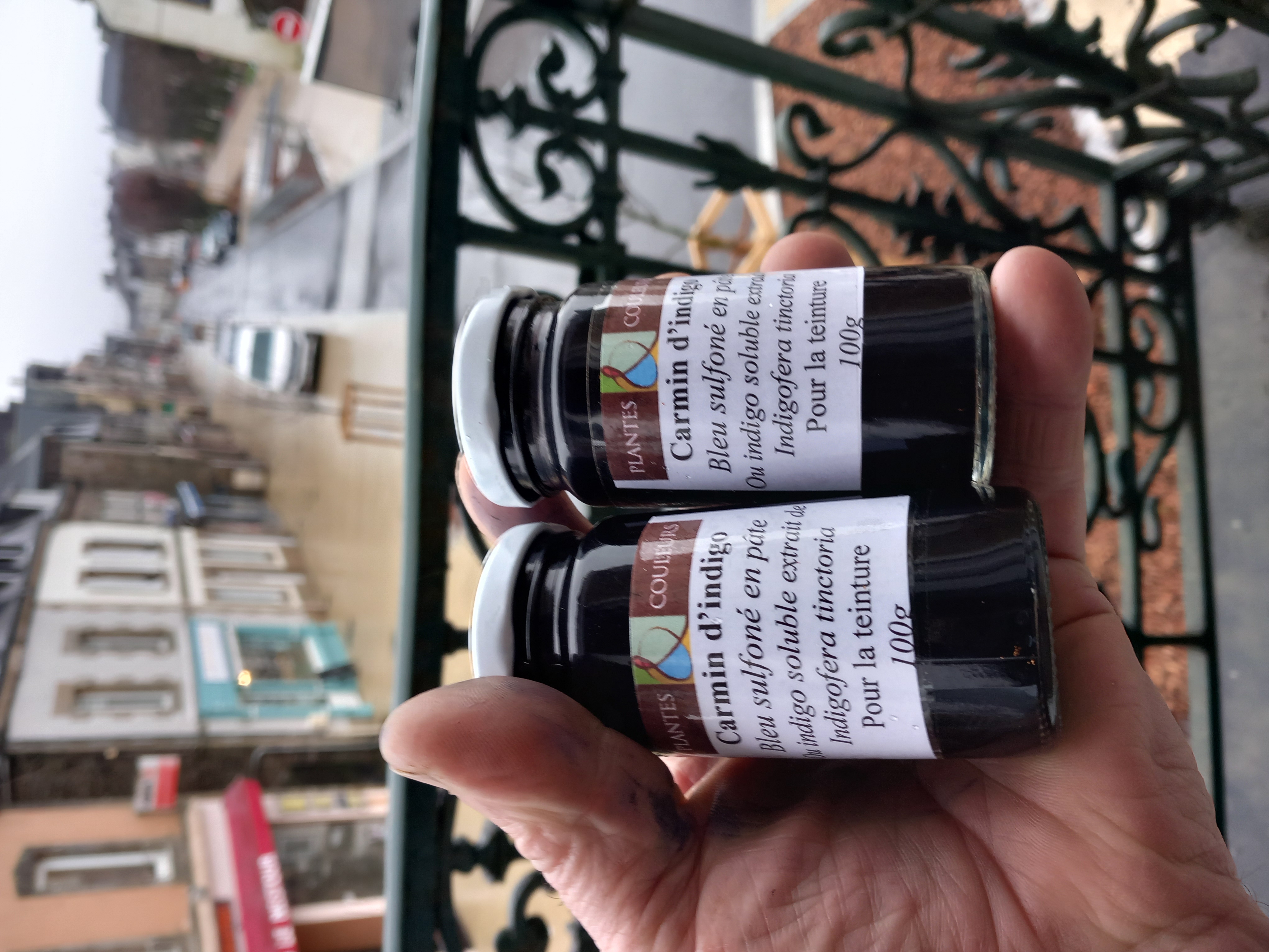 On peut faire son indigo sulfoné chez soi si on est un petit chimiste averti (acides dangereux), mais j'ai calculé que l'acheter me coûte le prix d'un indigo de qualité. Autant faire confiance aux pros.