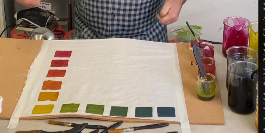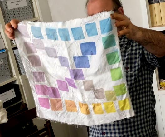 Michel Garcia y fait un gel à base de 15g d'indigo sulfoné en pâte par 100ml et produit un camaïeu de tons. On voit aux coins du sophora, du tanin/fer, du Saxe et de la cochenille, au centre du campêche, les mélanges entre les extrêmes - inscrivez-vous à ces cours en ligne ou en présenciel pour apprendre: