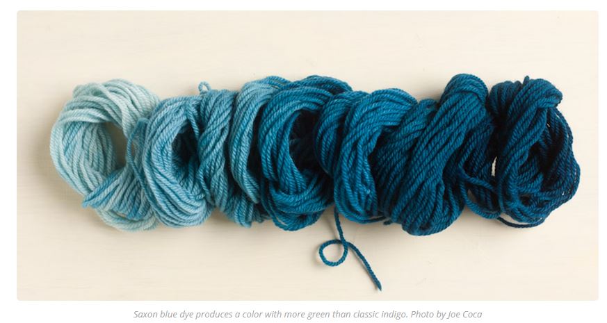 Pour du vert wade/jardin anglais, Botanical colors suggère 1-2% de Saxe et 3-5% de leur cachou liquide. Pour du mauve lilas, 5% de leur extrait garance liquide et 1% de Saxe. Dans un Feedback Friday, elles citent du vert avec 10% bois jaune/fustic et 10% saxon (leurs versions liquides). Rhubarbe et Saxe: vert olive.