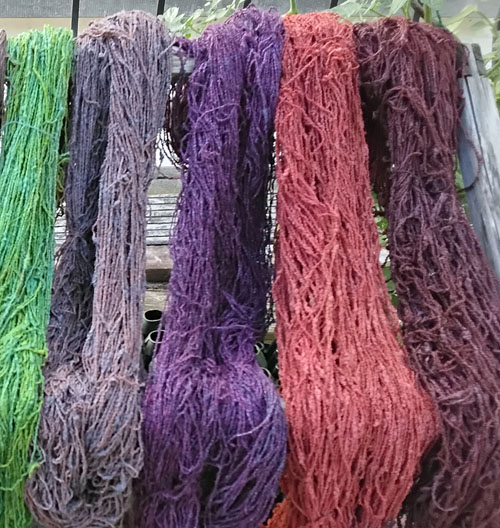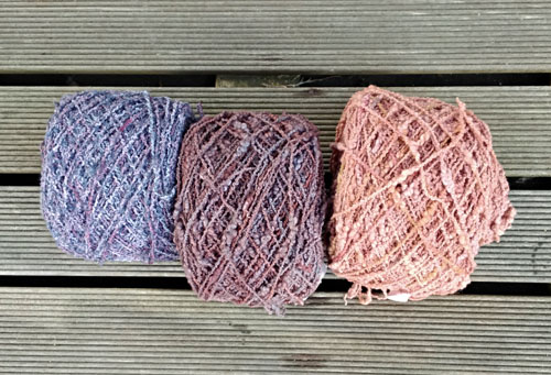 Sur la photo à gauche en haut: le fil de bouclette qui prend la teinture si bizarrement. 90 grammes. Indigo bleu moyen, puis AA deux fois, puis garance T. 3 extractions. Montée lente. Terne. Retour indigo. Toujours terne, mais moins moche.