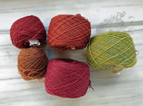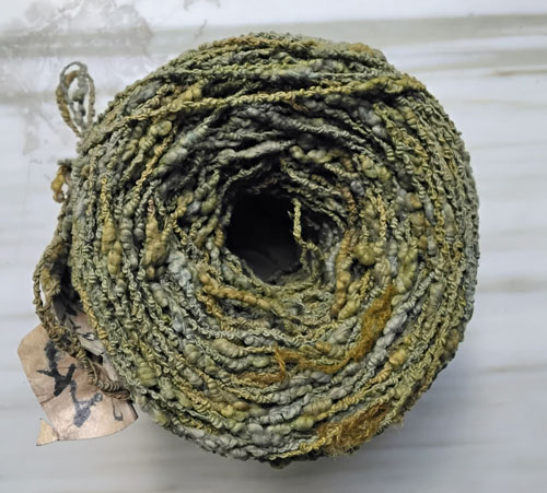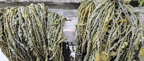 Il me restait une bobine de 250g de jaune flash quasi fluo de cotonlin 8/2 de chez Venne, ingérable en tissage. Plongé deux fois dans une cuve 123 indigo. Bof, comme à chaque fois (standard?), la teinture naturelle ne prend pas bien sur teinture du commerce. Même après avoir bien lavé l'écheveau.