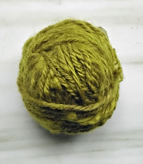 Laine fine 28/2 Venne, en gaude bain nr 2 puis deux fois court passage en cuve d'indigo 123 fruits = vert pré tendre