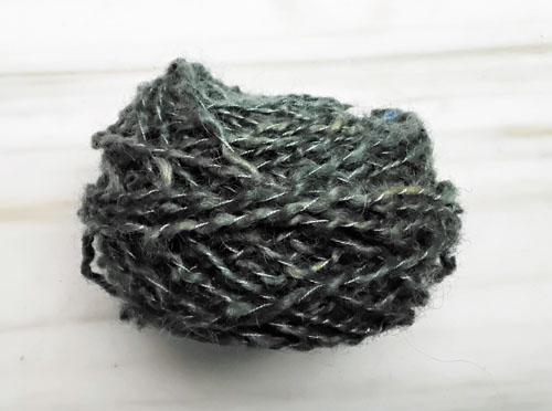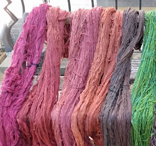 NB "soie". J'ai rangé un coin de l'atelier et retrouvé des filés main de chamelon (blond) et de mérinos (blanc), tous deux hyper moelleux (+- 18 microns à vue de nez). Célibataires, ils attendaient un retors, que j'ai réalisé avec ce que j'avais récupéré en vente de fin d'atelier comme "soie". Ce fil s'avère être d'un autre type, vu qu'il ne prend pas la teinture naturelle... J'ai pourtant fait le burn test: brûle et s'éteint, cendres gris/noir qui s'écrasent en poudre, fumée blanche, odeur typique cheveux brûlés.